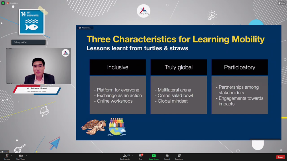โดยนางสาวอาทินุช เกศชัยชนา ได้นำเสนอประสบการณ์ความแตกต่างจากการเรียนรูปแบบเดิม และรูปแบบออนไลน์ซึ่งสามารถนำไปใช้สนับสนุนการเรียนรู้ SDGs ในอนาคต ทั้งนี้ ข้อคิดเห็นต่างๆ ของเยาวชนที่ได้จากการประชุมครั้งนี้ จะได้รับการนำเสนอในที่ประชุม the 8th ASEM Education Ministers’ Meeting (ASEMME8) ซึ่งจะจัดขึ้นรูปแบบการประชุมทางไกลระหว่างวันที่ 13-14 ธันวาคม 2564 ที่จะถึงนี้ด้วย