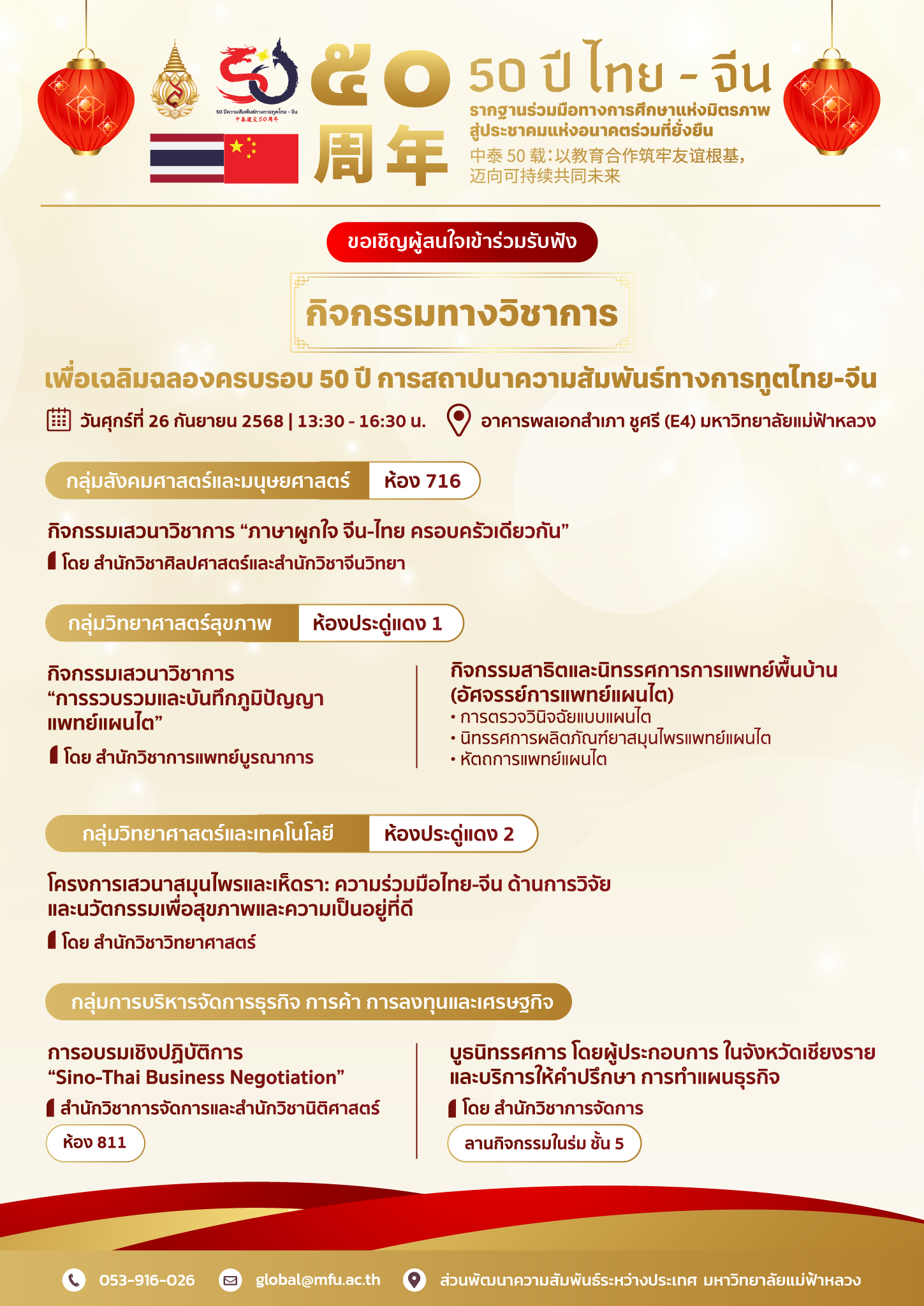 มหาวิทยาลัยแม่ฟ้าหลวงขอเชิญชวนประชาชนทุกท่านร่วมเฉลิมฉลองเหตุการณ์สำคัญทางประวัติศาสตร์ในงาน "50 ปี ไทย-จีน รากฐานความร่วมมือทางการศึกษาแห่งมิตรภาพ สู่ประชาคมแห่งอนาคตร่วมที่ยั่งยืน" ในวันศุกร์ที่ 26 กันยายน 2568 ณ มหาวิทยาลัยแม่ฟ้าหลวง จังหวัดเชียงราย