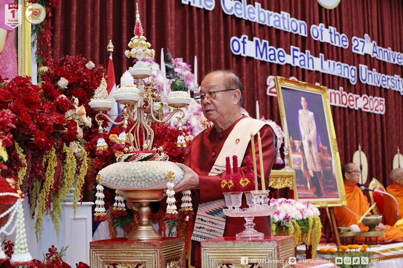 มหาวิทยาลัยแม่ฟ้าหลวง (มฟล.) จัดพิธีฉลองครบรอบ 27 ปีแห่งการสถาปนา เมื่อวันที่ 25 กันยายน 2568 ณ มหาวิทยาลัยแม่ฟ้าหลวง จังหวัดเชียงราย กิจกรรมสำคัญเริ่มตั้งแต่เวลา 06.30 น. ด้วยการถวายภัตตาหารเช้าแด่พระสงฆ์ ณ อาคารปฏิบัติการทางวิทยาศาสตร์และเทคโนโลยี (S2) ตามด้วยพิธีทำบุญตักบาตรพระสงฆ์ 160 รูป ณ ลานดาว เวลา 07.00 น. โดยมีศาสตราจารย์พิเศษ ดร.วันชัย ศิริชนะ นายกสภามหาวิทยาลัยแม่ฟ้าหลวง กรรมการสภามหาวิทยาลัย ผู้ช่วยศาสตราจารย์ ดร.มัชฌิมา นราดิศร อธิการบดี ผู้บริหาร พนักงาน และนักศึกษาร่วมกันทำบุญ
