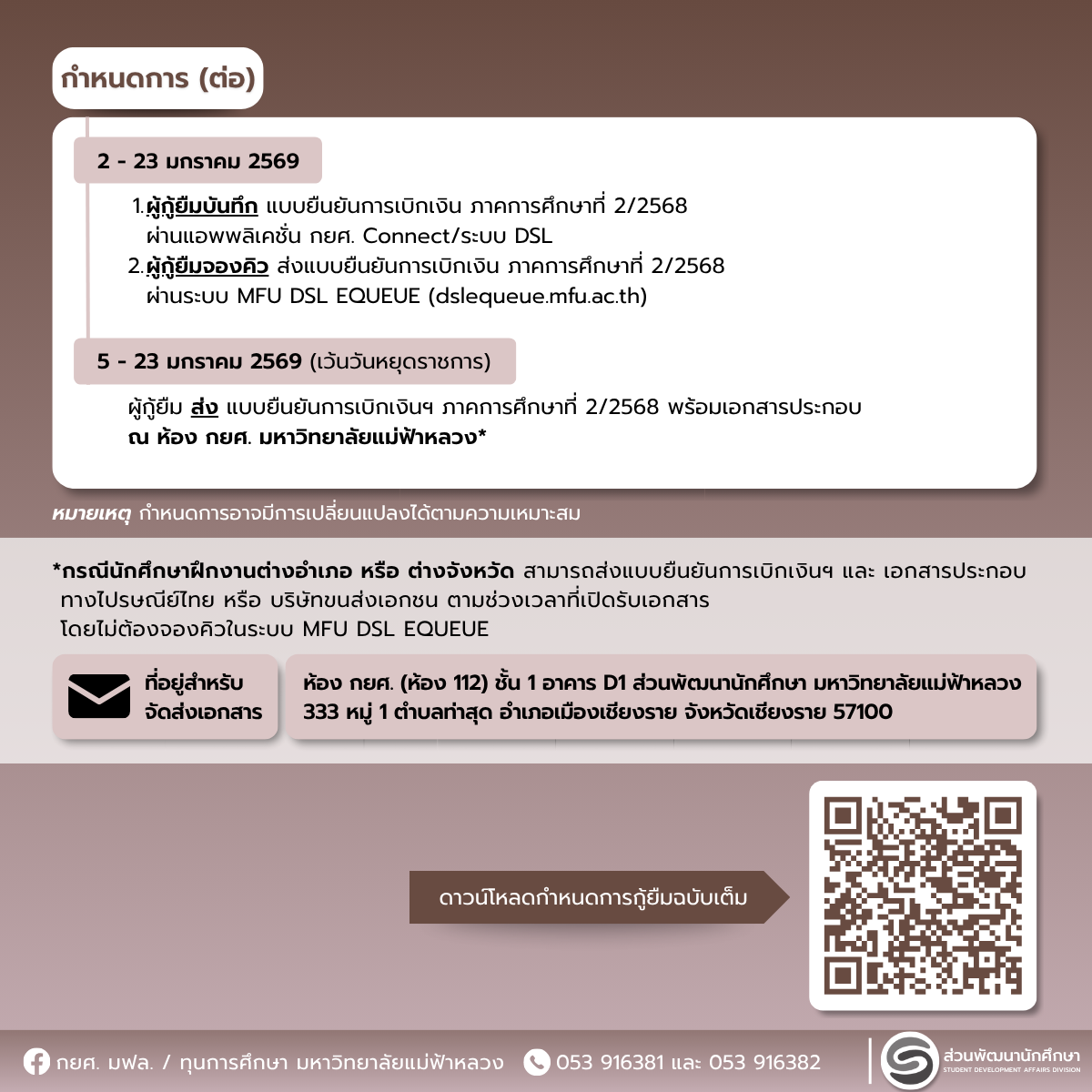 ที่อยู่สำหรับจัดส่งเอกสาร: ห้อง กยศ. (ห้อง 112 ) ชั้น 1 อาคาร D1 ส่วนพัฒนานักศึกษา มหาวิทยาลัยแม่ฟ้าหลวง 333 หมู่ 1 ตำบลท่าสุด อำเภอเมืองเชียงราย จังหวัดเชียงราย 57100
